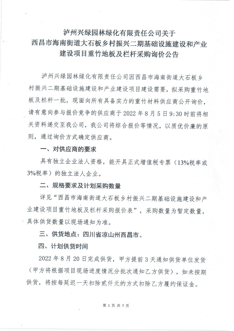西昌市海南街道大石板鄉(xiāng)村振興二期基礎(chǔ)設(shè)施建設(shè)和產(chǎn)業(yè)建設(shè)項目重竹地板及欄桿采購詢價公告
